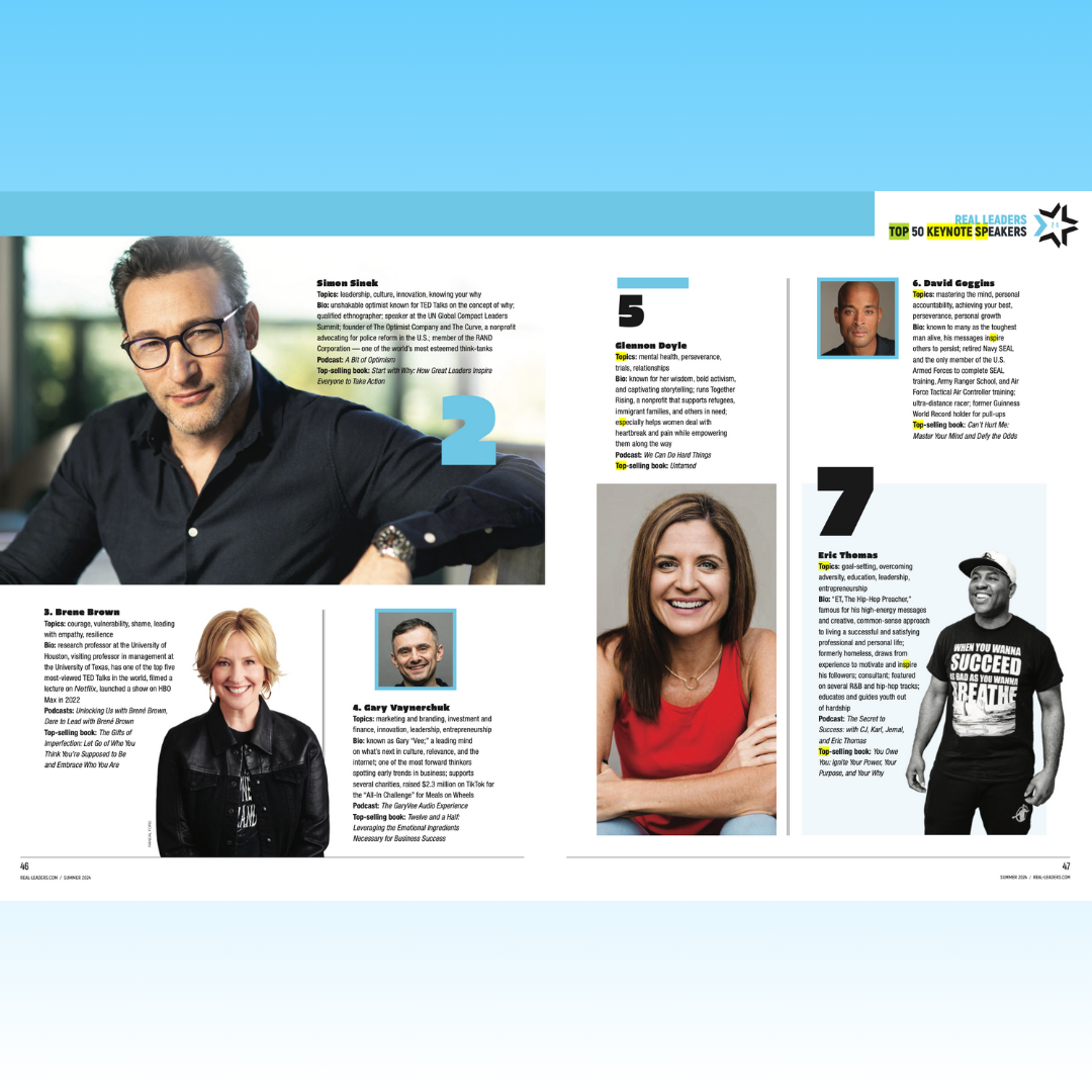 The 2025 Top Keynote Speakers will be featured in Real Leaders magazine and online. Magazines are available in Hudson News, Barnes & Noble, and Sky Lounges across the U.S and Canada.