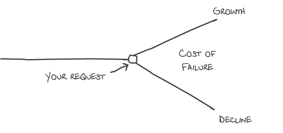 2. Make your WHY compelling. When powerful people don’t want to do WHAT you want them to do your best strategy is to amplify WHY they should go along. Gandhi negotiated India’s independence by dramatizing the moral imperative that triggered England’s higher conscience. Low power leaders who take control of the WHY bring about virtually all social change. A moral WHY works very effectively on social issues but not very effectively in business settings. In business you take control of the WHY by making a clear and graphic business case argument. One of the best graphics to use is a Y resting on its side. decision treeThis graphic allows you to focus a leader’s attention on the reality that they are at a crossroads. The correct decision will lead to an upward path towards greater growth and profitability. The wrong decision will lead to a steep and steady decline. The gap between the upward path and the downward path is the cost of not making the decision you’re advocating. You will need evidence and data to back up your graphic. But the visual depiction of the consequences of not making the right decision is what will stand out in the optic nerves in the heads of your leaders. Our brains are dominated by our optic nerves system which enables us to visualize. This triggers fear-of-loss emotions which are necessary to make hard decisions.