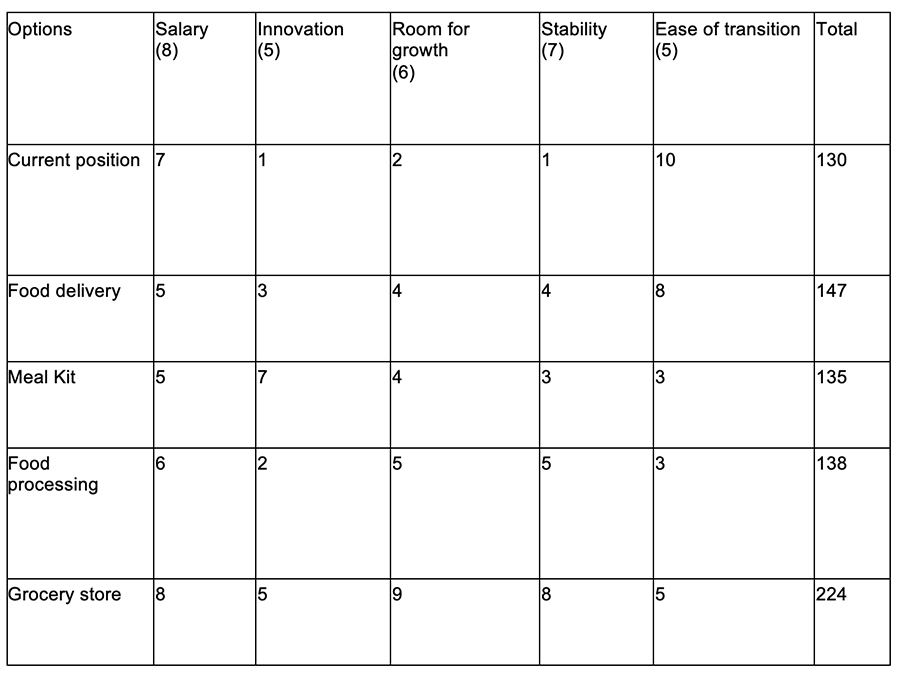 At this point, Alex was still leaning towards her favored option, which was to shift to the food delivery industry. However, I cautioned her to consider each one carefully. We went together through each option, and she ranked each option on each criteria variable. We made a table with options on the left and variables on the top to do so. Then, after ranking each option on the relevant criteria, we multiplied the ranking by the weight of the criteria.