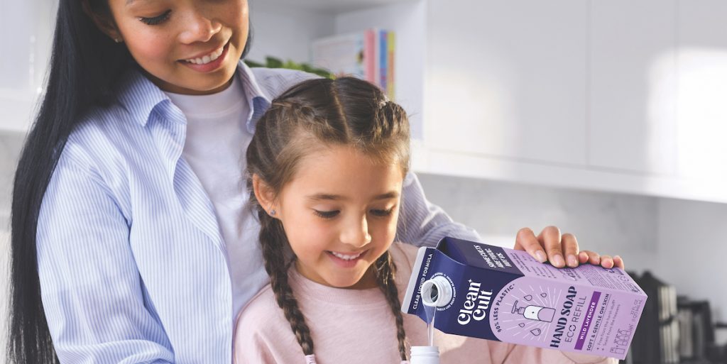 Lupberger spent a year traveling the U.S. to find the best solution and ended up having his own machinery built to create a patented, recyclable cardboard refill packaging similar to milk cartons that consumers are encouraged to transfer into glass dispensers (which they can purchase from Cleancult) for at-home use. The company uses Forest Stewardship Council-certified paper. Recently, it also introduced refillable aluminum bottles. Cleancult has diverted over 7 million pounds of plastic from landfills and oceans.