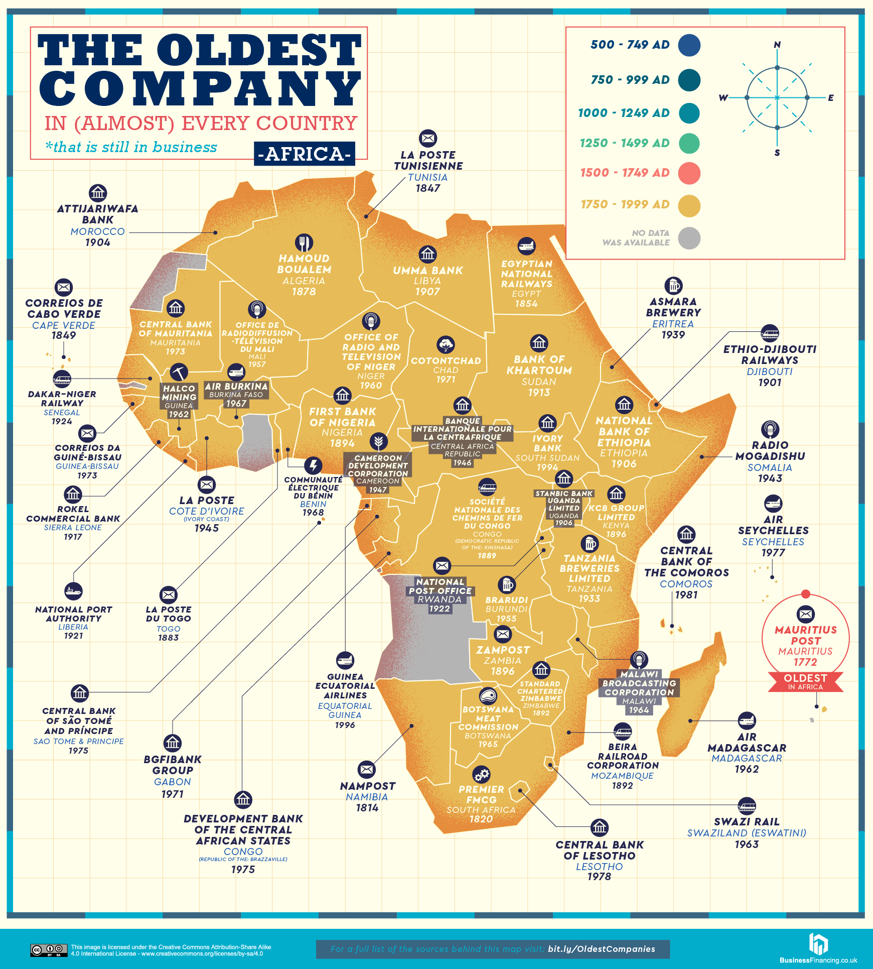 Civilization apparently dates back to Africa, but its oldest businesses still operating today aren’t quite so old as that. The oldest is the Mauritius Post, which opened in 1772 to deliver mail around what was a French colony at the time. NamPost in Namibia is another early postal service on the continent, having been founded in 1814 to help people across the country keep in touch.