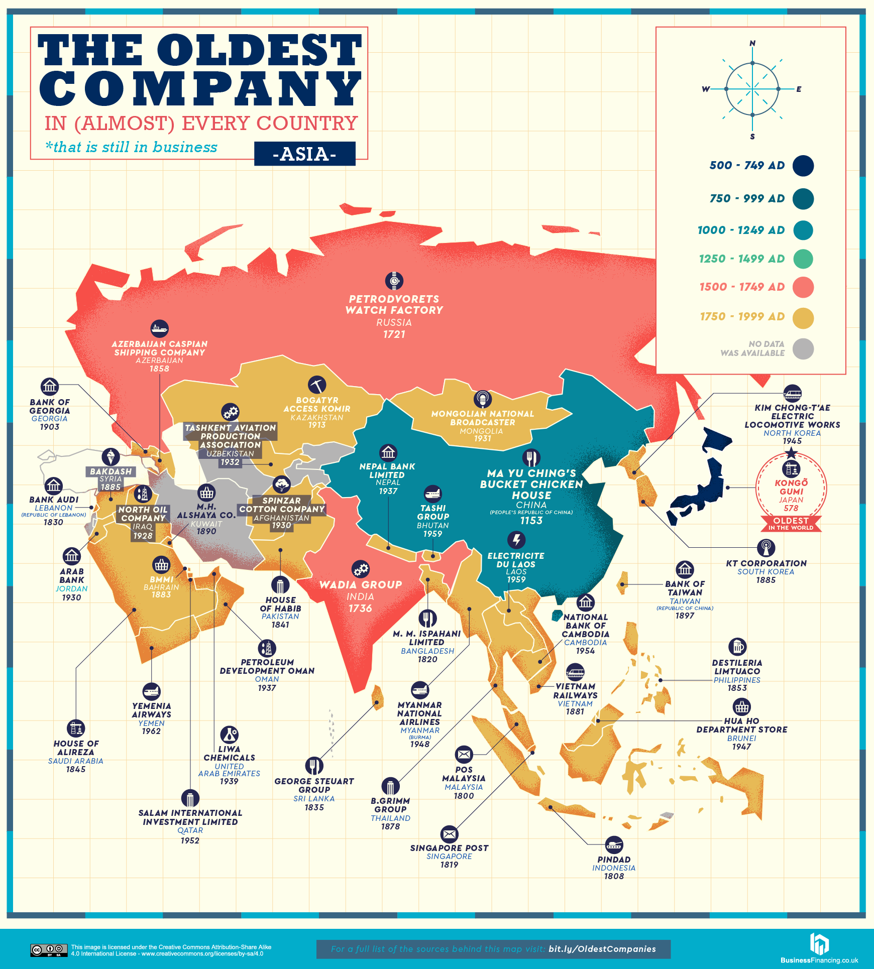 Those countries where it wasn’t possible to identify the oldest business have been greyed-out on the map. Additionally, some countries have changed names or didn‘t exist at the time the oldest company opened. In all cases we have used the current country names.