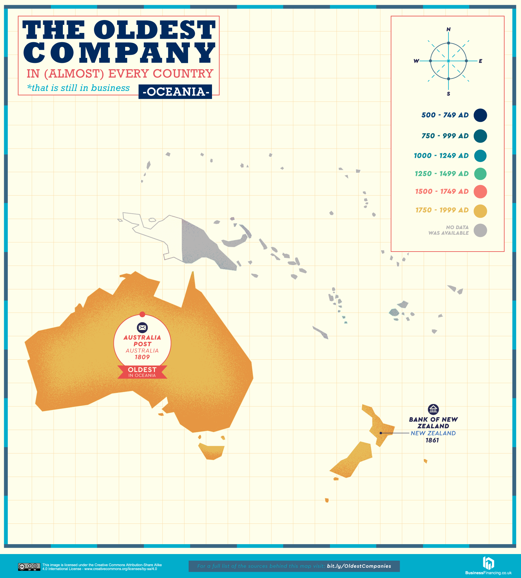 Speaking of post offices, the oldest company in Oceania is also one set up to deal with mail. Now known as AusPost after the merger of several smaller services, it dates back to 1809 when a former convict Isaas Nichols was put in charge of New South Wales’ post, which mostly meant stopping people from stealing it when it arrived at port. Now that is leading by example.Which of the companies set up today by inspirational leaders do you think might one day have lasted as long as some of these businesses