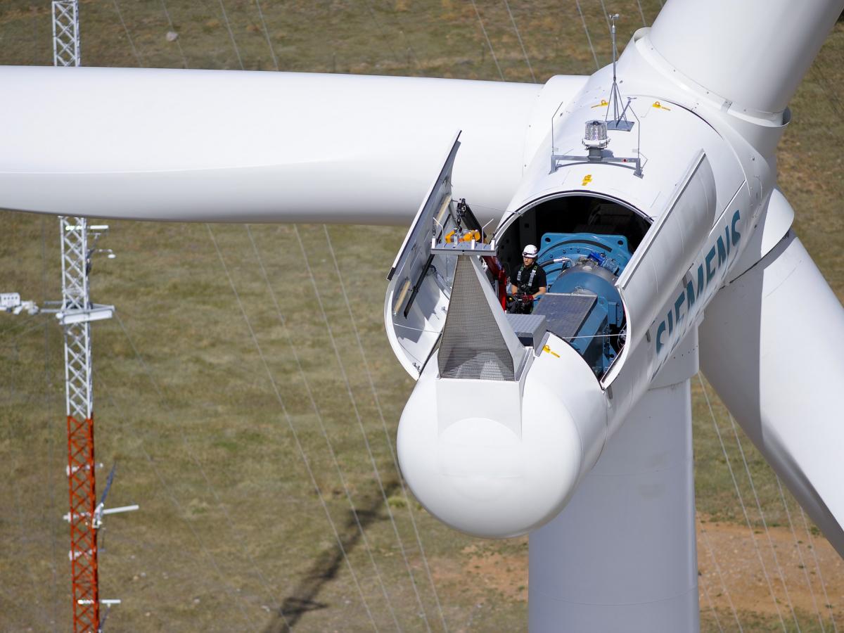 A technician makes adjustments to a wind turbine at the National Wind Technology Center in Boulder, Colorado.