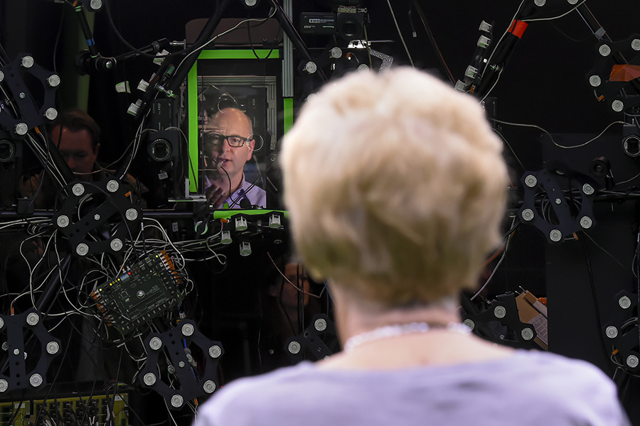 Targeting the immediacy of in-person storytelling, the New Dimensions team interviewed Gutter and more than a dozen other Holocaust survivors, asking them hundreds of questions in multiday sessions. The interviews took place on a soundstage inside of what looked like a giant geodesic dome. Mounted on the inside of the dome were thousands of tiny LED lights and 30 cameras recording the survivors from every angle.