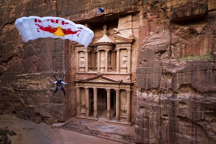 Red Bull Air Force Team member Miles Daisher chose Petra, one of the Wonders of the World, as the stunning location to celebrate his 4,300rd BASE jump and make history.