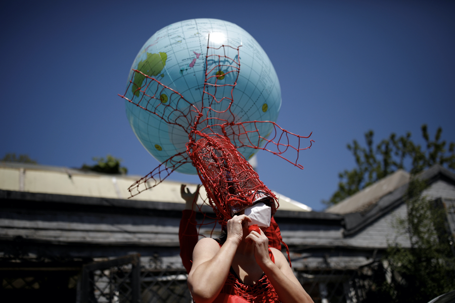 Wearing a dress she made of eight giant plastic inflatable roses over a wire structure and a headpiece crowned by a globe, Chinese performance artist Kong Ning is using fashion to draw attention to environmental protection.