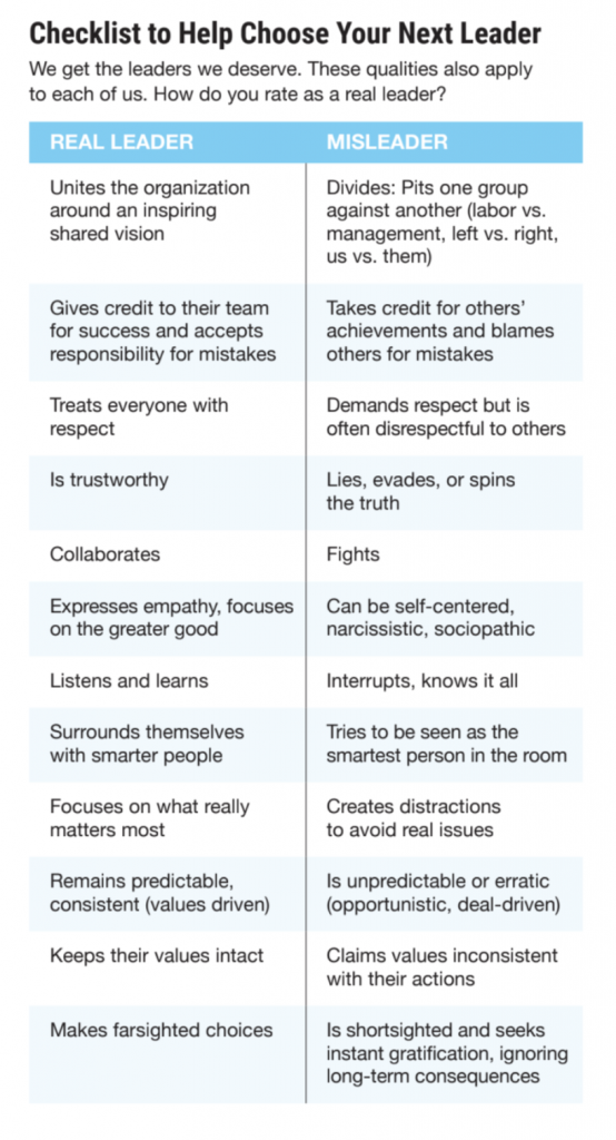 We have the power to be more thoughtful about choosing our leaders. There is too much at stake to make emotional decisions about who we “like” the most. In the last 10 years, Real Leaders has interviewed hundreds of successful leaders from all over the world. We often ask what they see as the difference between a real leader and a misleader. Their answers may be helpful for all of us to consider whenever we are hiring or voting for anyone in a leadership position. It’s up to us to choose real leaders in all sectors and to send the misleaders packing. Imagine the impact farsighted leadership could have.