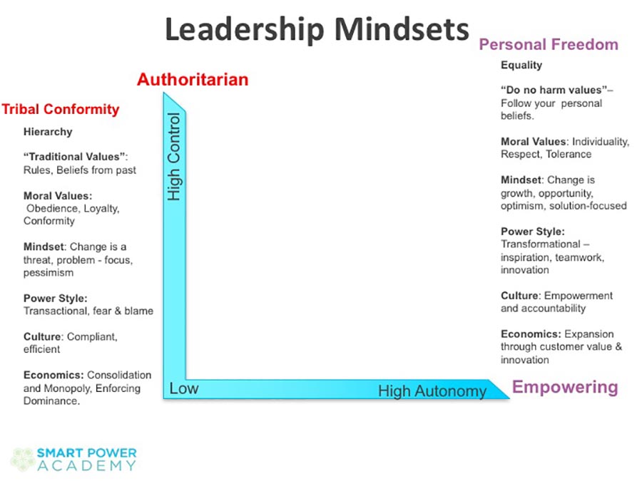 Authoritarian leaders act on the premise that they know more and are more capable than the collective talent of their employees. Their mindset is dominance. The most common business strategy of an authoritarian leader is to achieve a dominant market position through mergers and acquisitions, consolidate to economic power and drive efficiencies. The consulting firm PwC recently found that the authoritarian model leadership is most admired by other authoritarian leaders. A leadership literature review covering 5,000 years of leadership biographies dating back to Alexander the Great powerfully reinforce our cultural assumptions about effective leadership. We hero-worship authoritarian leaders who are competitive, decisive and confident to the point of arrogance. The result is the world we have.