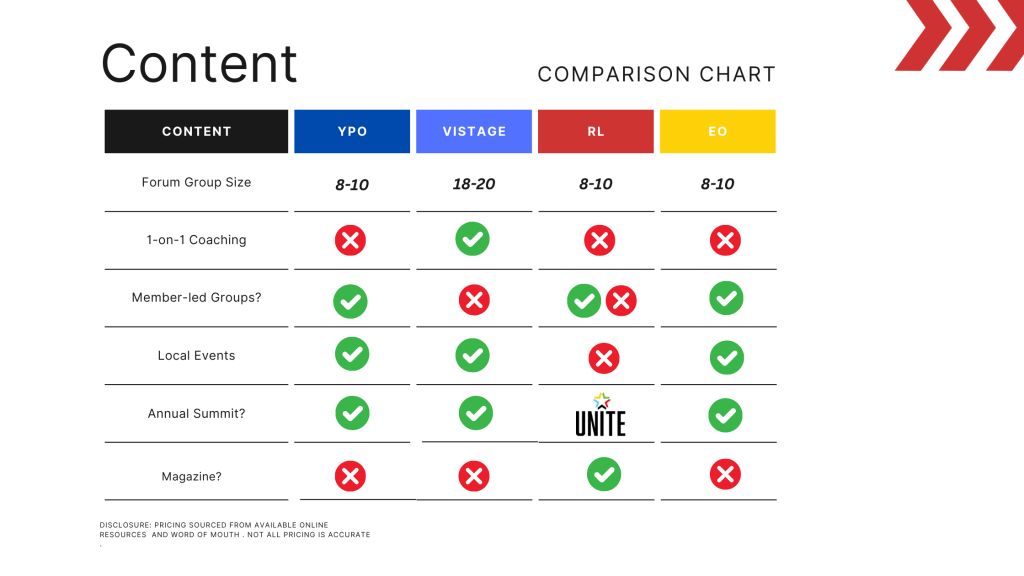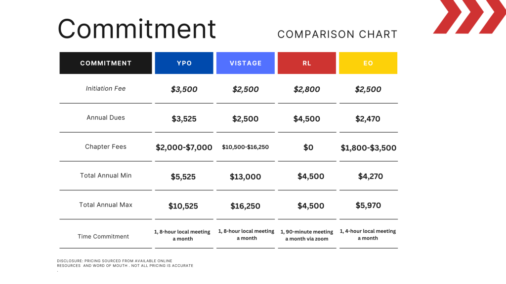 Whether you’re at the beginning or final stages selecting a leadership network, it’s important to know what to look for and what questions to ask your recruiter so that you have clarity on what to expect. This comprehensive guide was created to guide you through 3 crucial categories—Criteria, Commitment, and Content to determine which of the 4 major networks (YPO, Vistage, EO, and RL) are best for you.