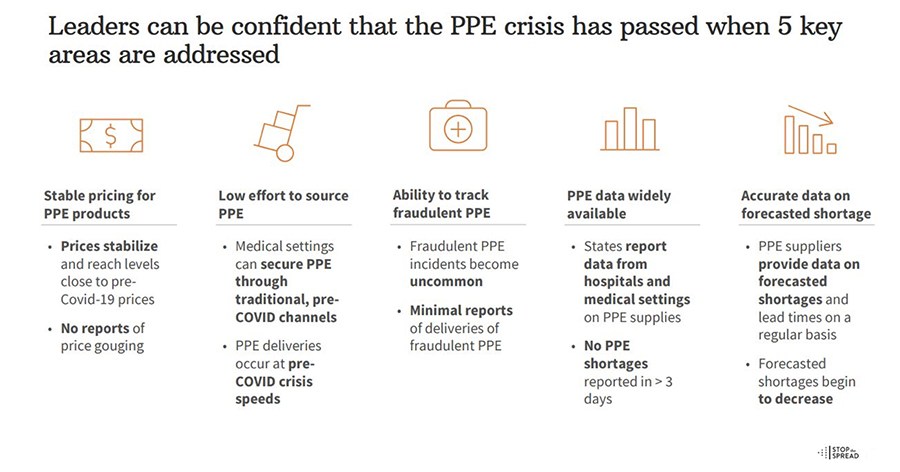 How will we know when the PPE crisis has passed? According to research by Stop the Spread (STS), a coalition of 1,300+ CEOs and executives working to catalyze the private sector response to COVID-19, we can be confident that the PPE crisis has passed once key areas are addressed: stable and transparent pricing for PPE; robust and resilient supply chains; ability to track fraudulent PPE; widely available, accurate data on PPE availability to help forecast shortages.