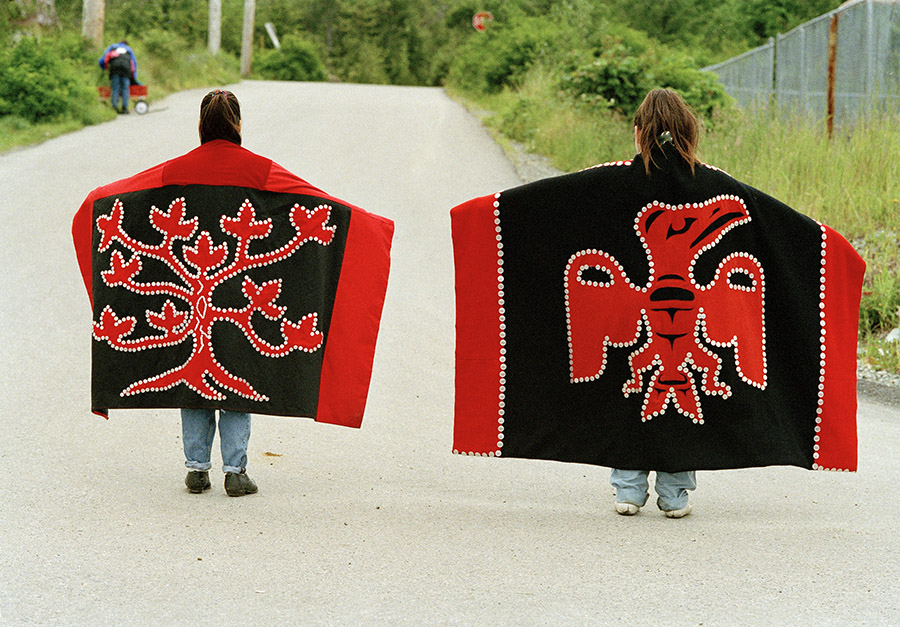 Two members of the Quileute Nation displaying the intricate patterns of their button blankets during the Qatuwas Festival of the indigenous nations of the Pacific Rim.