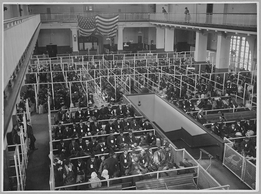 The pens at Ellis Island, Registry Room (or Great Hall). These people have passed the first mental inspection.
