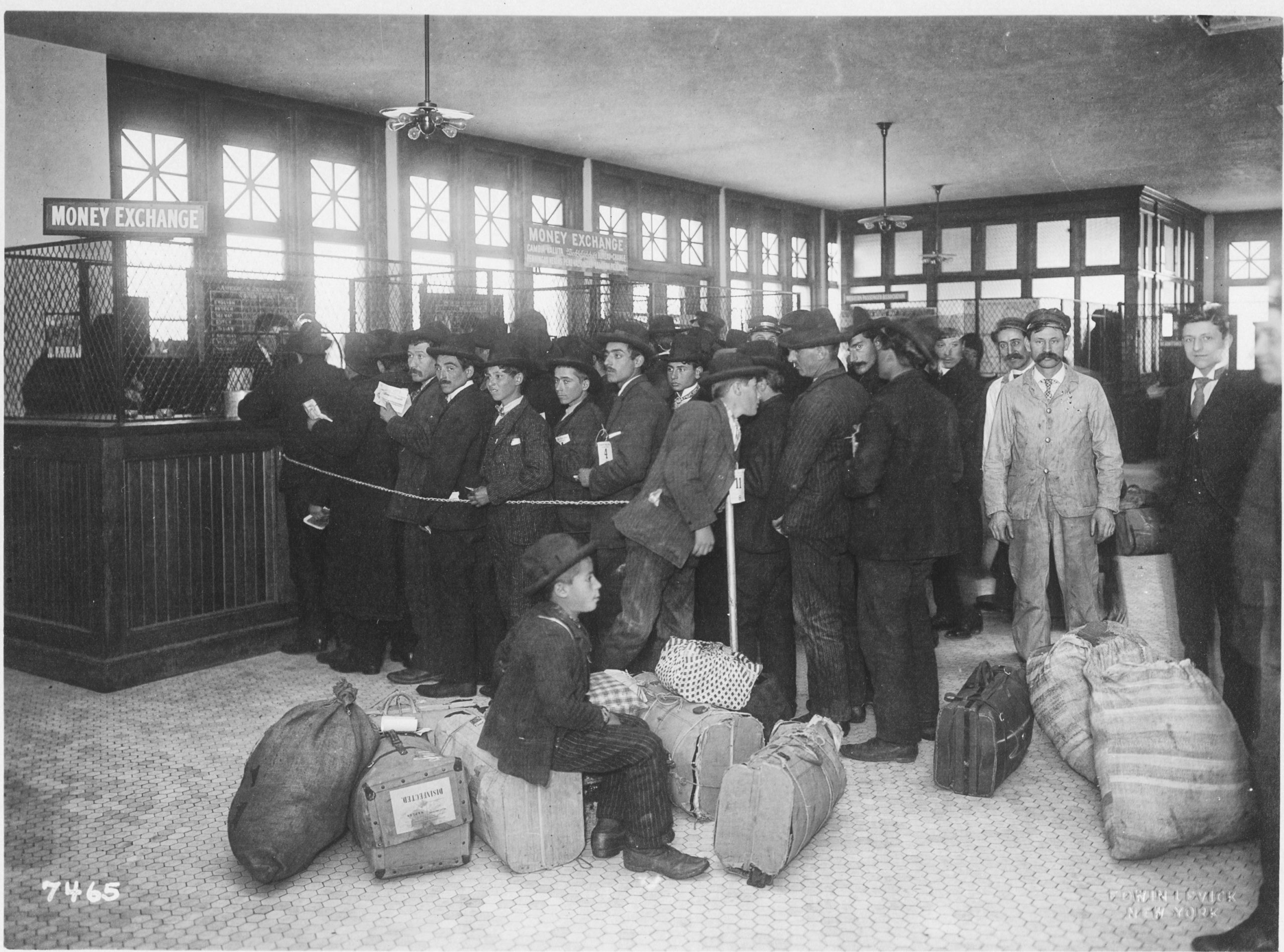 Ready for travel and going North, South and West. Immigrants with baggage lined up at a teller’s window to exchange money.