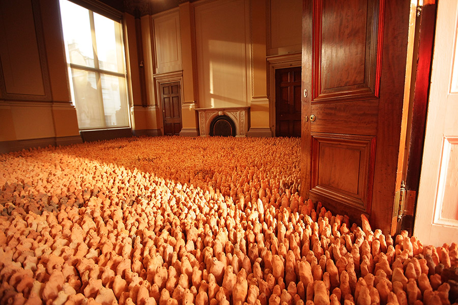 British artist Antony Gormley is well known for his life-size statues which mimic the human body. His Field series represents a different approach. Each work consists of tens of thousands of small clay figures, each of them between 8 and 26 cm high. They are all installed on the floor of a room facing the viewer. Gormley states that he wants to make works about our collective human future and our responsibility for it. His artwork aims to look back on its makers and the viewers as if they are all responsible for the world.
