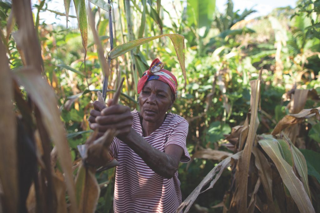 Mrs. Ovoyel Edouard picks corn. She is a member of the OPDL coopertive which is a PDL partner in La Victoire, Haiti.