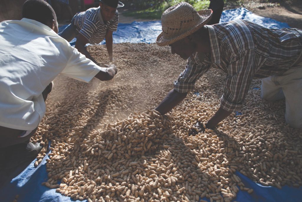 OPDL cooperative members spread out peanuts in the sun before storing them in the seed bank for next season.