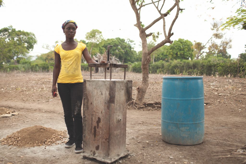 Mireille Petit-Frere, a water filter technician, builds cement water filters for gwoupman members in Carrefour, Haiti.